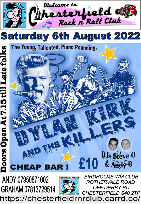 Wowzer Dylan Kirk and the Killers are your next band on at Chesterfield rock n roll club folks ...and this one is going to be a fantastic night with the talented Dylan on the ivories and boy can this lad play with his talented band The Killers dont miss this one ...again its all pay on the door folks £10 no tickets required !! see ya there xxx