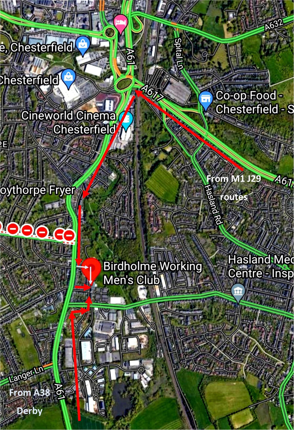 From j29 M1 to A617 into Chesterfield then at the Roundabout first left up Derby road A61 were only 3 mins away ..then turn left onto Lincoln street or the next left king street s this brings you onto Rothervale road and the clubFrom Derby and the A38 go thro Alfreton on the A61 - Clay Cross - Old Tupton - then as you come into the Chesterfield area of Birdholme turn right at the lights Storforth lane then first left onto Rothervale rd and the club is on your Right !Birdholme Working Mans Club